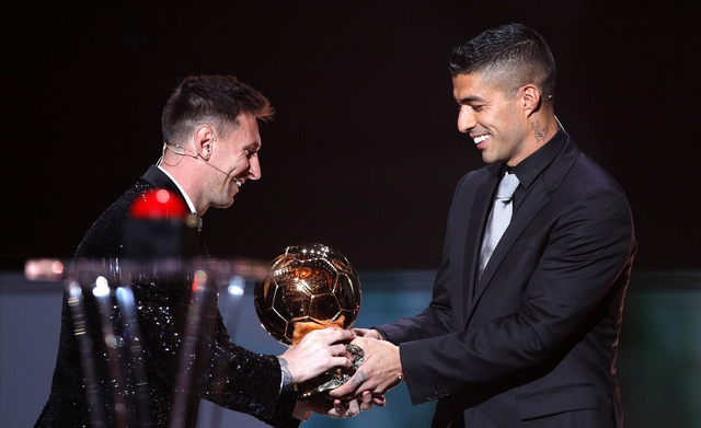 苏亚雷斯为梅西颁发金球奖