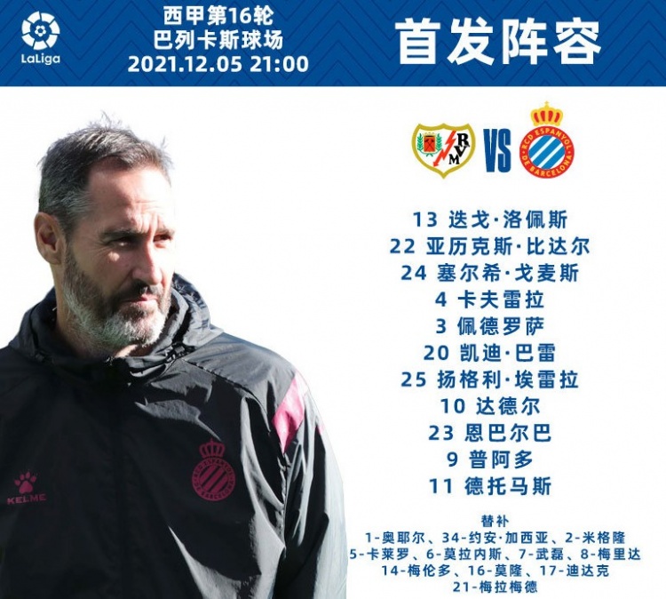 武磊替补!西班牙人vs巴列卡诺首发:德托马斯先发,法尔考替补