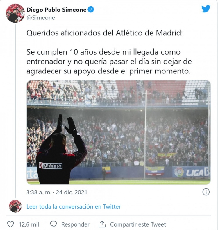 西蒙尼执教马竞十周年感言:我一直感觉马竞就是我的家
