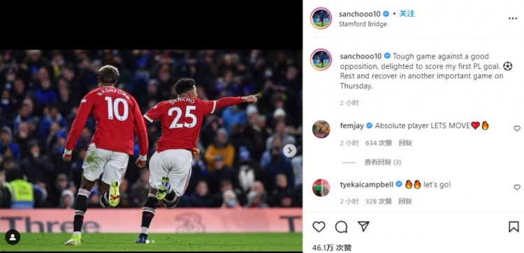 桑乔:对阵劲敌的艰难一战,很高兴斩获英超首球