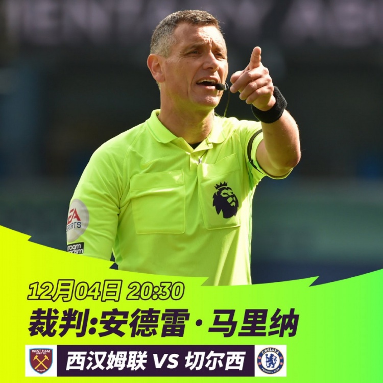 英超第十五轮主裁名单:马里纳执法切尔西,迈克-迪恩执法枪手