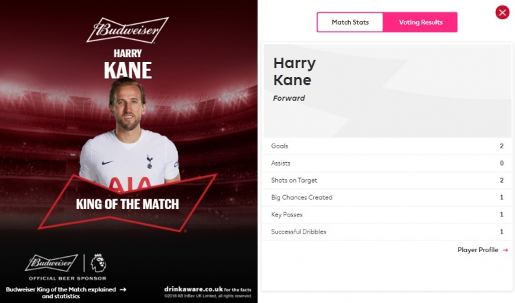 梅开二度,英超官方:凯恩当选热刺vs埃弗顿全场最佳球员