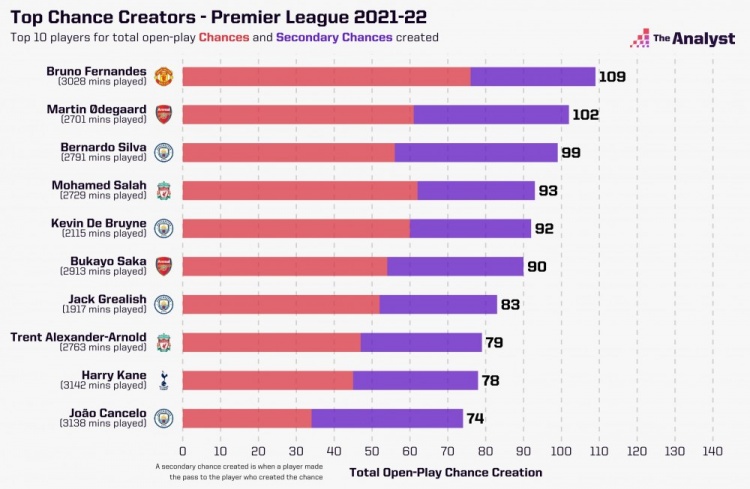 本赛季英超创造机会数前十:B费第1厄德高第2,前十曼城4人