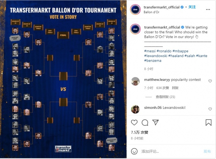 足球导航网11月23日讯 德转公布了自己投票模拟的金球奖评选,目前已经角逐出了8强,分别是梅西、莱万、本泽马、姆巴佩、哈兰德、坎特、萨拉赫和C罗。