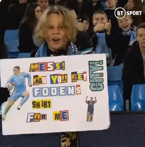 足球导航网11月25日讯 欧冠曼城vs巴黎,场边一位曼城小球迷举着牌子,上面写道:“梅西,你能帮我拿到福登的球衣吗?”