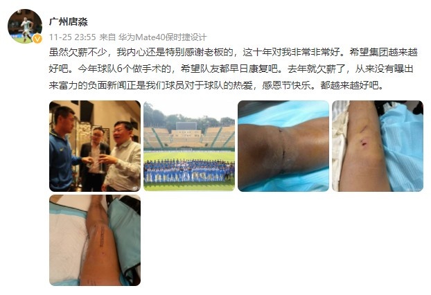 唐淼写道:“虽然欠薪不少,我内心还是特别感谢老板的,这十年对我非常非常好。希望集团越来越好吧。今年球队6个做手术的,希望队友都早日康复吧。去年就欠薪了,从来没有曝出来富力的负面新闻正是我们球员对于球队的热爱,感恩节快乐。都越来越好吧。 ”