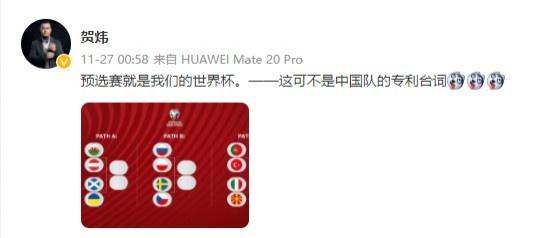 对此,贺炜调侃道:“预选赛就是我们的世界杯。——这可不是中国队的专利台词”