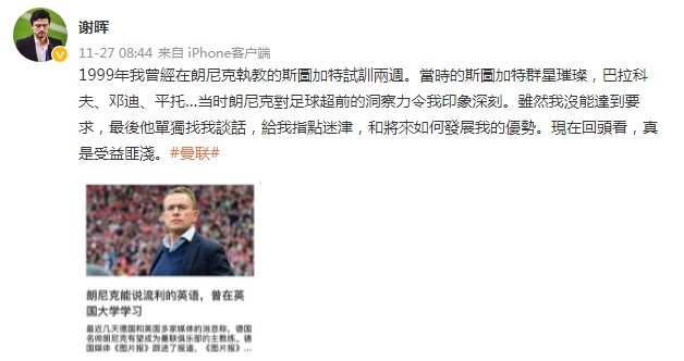 谢晖:1999年我曾經在朗尼克執教的斯圖加特試訓兩週。當時的斯圖加特群星璀璨,巴拉科夫、邓迪、平托…当时朗尼克對足球超前的洞察力令我印象深刻。雖然我沒能達到要求,最後他單獨找我談話,給我指點迷津,和將來如何發展我的優勢。現在回頭看,真是受益匪淺