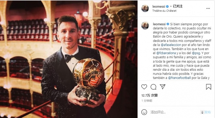足球导航网11月30日讯 梅西今日获得个人第七座金球奖,梅西也更新动态谈到了心情。