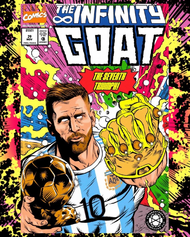足球导航网11月30日讯 梅西获得第七座金球奖,ICC冠军杯官方晒图祝贺。图片仿照漫威《无限战争》,图中灭霸梅西戴上无限手套,手捧金球化身无限“GOAT”