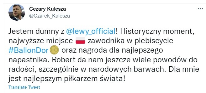 “历史性时刻,这是波兰球员在金球奖评选中获得的最高成就,还获得最佳射手。罗伯特让我们感到快乐,尤其是他身披国家队战袍的时候。对我来说,他就是世界上最好的足球运动员!”