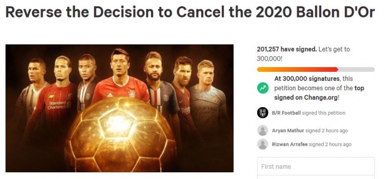 B/R发起请愿呼吁《法国足球》撤销此前取消2020年金球奖的决定。请愿目标是30万人签名,目前已经收集到201257人的签字。