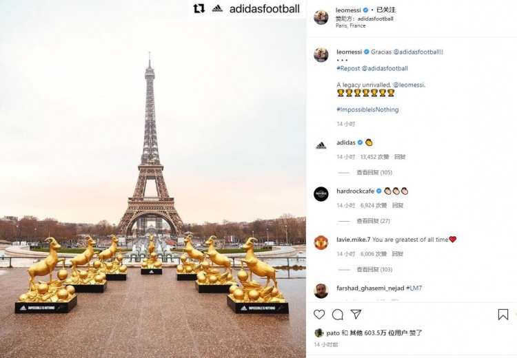 足球导航网12月1日讯 梅西获得2021年金球奖,阿迪在埃菲尔铁塔前展示了7座脚踏金球的山羊(GOAT)表示祝贺,球员本人转发晒照。