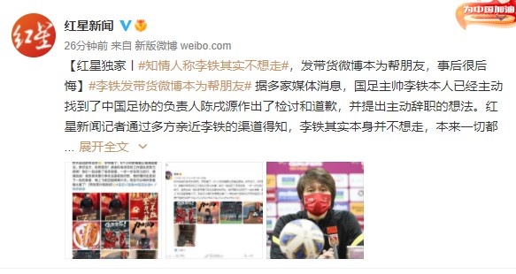 红星新闻独家消息,知情人称李铁本来并无辞职的计划,发带货微博本为帮朋友,事后很后悔。