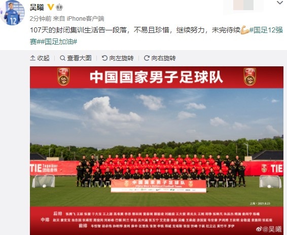 足球导航网12月2日讯 国足在今天结束了在苏州14天的封闭隔离,全队前往上海进行为期7天的健康监测。国脚吴曦通过微博,对这段时间的隔离生活与未来,发表了感触。
