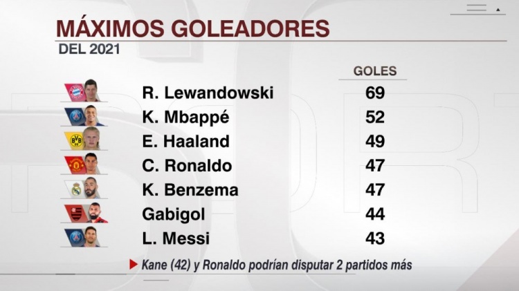 足球导航网12月23日讯 2021年已近尾声,ESPN统计了本年度射手榜,莱万在各项赛事打进69球居首,C罗47球并列第四,梅西43球第七。