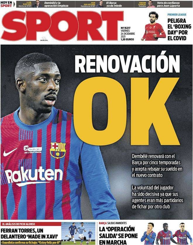 足球导航网12月24日讯 每日体育报今日头版为登贝莱与巴萨续约已经达成,对于经纪人更倾向于让他去另一家俱乐部,他的意愿是决定性的。