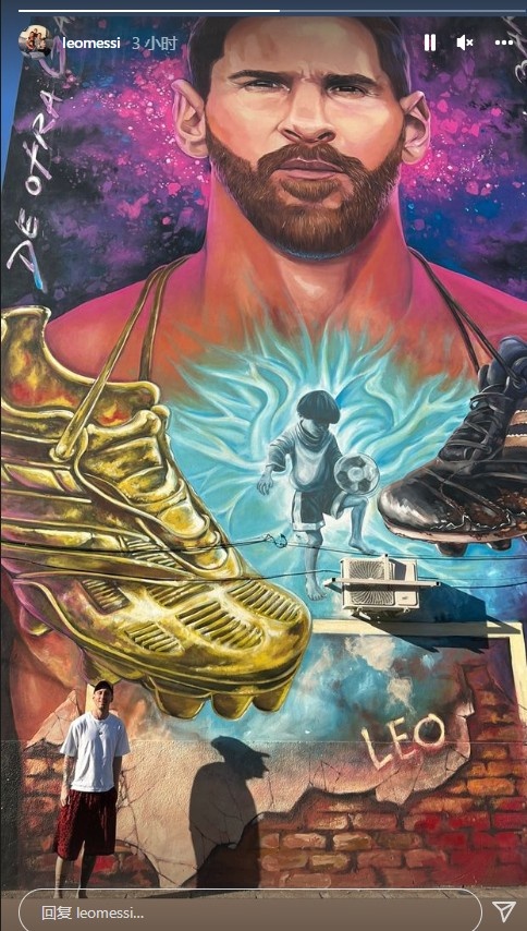 足球导航网12月25日讯 梅西在INS上晒出巨幅炫酷壁画,梅西穿着白T和裤衩站在左下角。