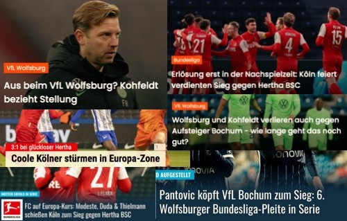 1.德甲联赛第18轮,科隆客场3-1击败柏林赫塔,朝着欧战区前进;沃尔夫斯堡客场0-1不敌波鸿遭遇联赛六连败,科菲尔特也可能下课。