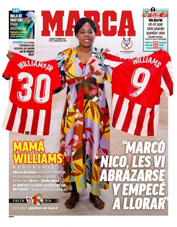 1、“威廉姆斯母亲”,毕巴19岁的青训小将尼科-威廉姆斯在西超杯半决赛与马竞的比赛中一鸣惊人,他的母亲玛利亚表示:“当看到尼科进球后与他的哥哥(毕巴主力前锋伊纳基-威廉姆斯)拥抱时,我忍不住激动落泪,希望毕尔巴鄂竞技可以凭借一个威廉姆斯的进球赢得西超杯冠军。”