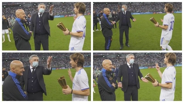 莫德里奇拿了奖杯后走到安帅面前,安切洛蒂调侃道:“你在禁区外传球的话,那是你不应该错过的一次助攻。”