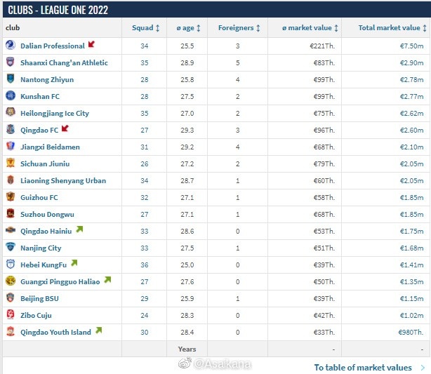 足球导航网1月18日讯 德国转会市场网站更新了中甲球队、球员身价,大连人以750万欧元身价排名第一,并包揽了球员身价前三名。