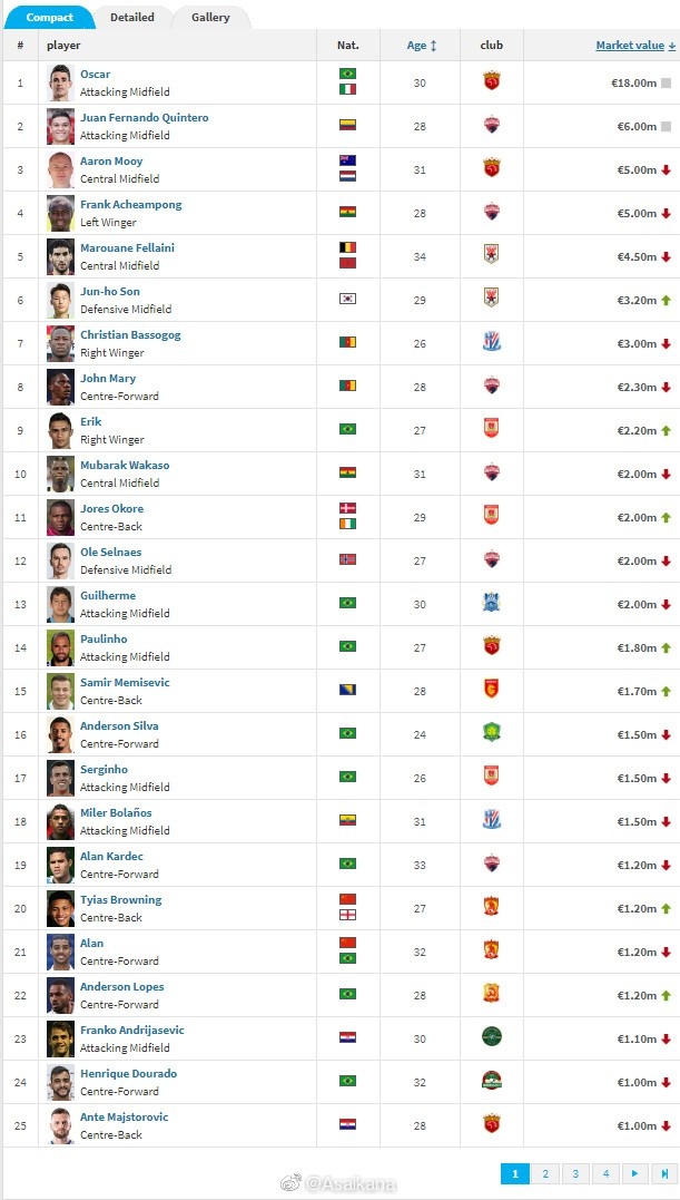 此次更新后,上海海港外援奥斯卡依然以1800万欧元身价遥遥领先中超身价榜,深圳队球员金特罗以600万欧排名第二,上海海港队外援穆伊和深圳队的阿奇姆彭以500万欧元并列排名第三。排名第5到第10的分别是:第5费莱尼(450万欧元),第6孙准浩(450万欧元),第7巴索戈(300万欧元),第8何塞·马里(230万欧元),第9埃里克(220万欧元),并列第10瓦卡索、奥科雷、塞尔纳斯、吉列尔梅(200万欧元)。附图1-4列出了中超联赛前100名球员列表。