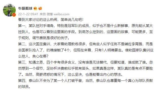 足球导航网1月22日讯 近日,海港将挖角山东泰山球员的传闻引发了热议,泰山跟队记者牛志明也发文谈到了此事。