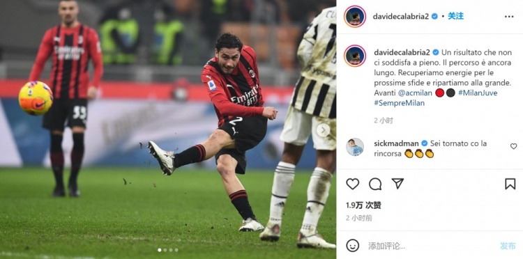 赛后米兰后卫卡拉布里亚在社交媒体上晒出自己的比赛照片,并写道:“这样的结果无法让我们完全满意,但这条路还很长。让我们为接下来的挑战恢复体能,以杰出的方式再次出发。”
