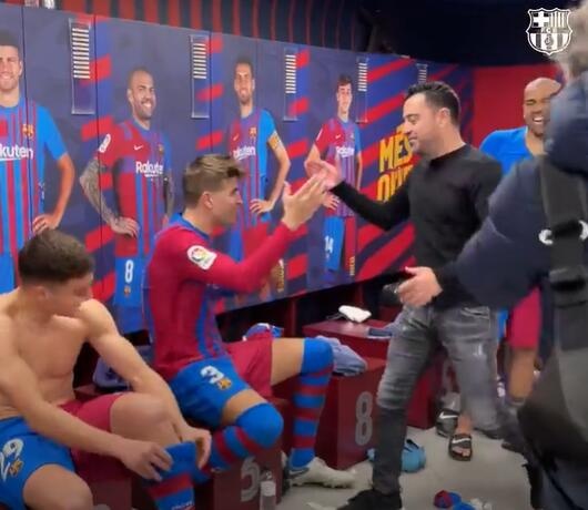 足球导航网2月7日讯 西甲第23轮,巴萨主场4-2战胜马竞,赛后哈维在更衣室一一向所有球员与工作人员表示祝贺。