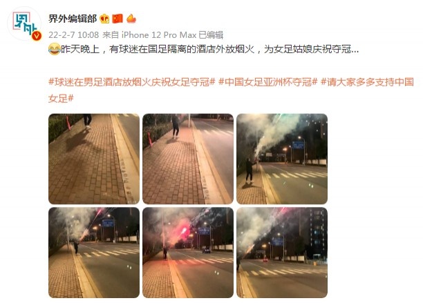 足球导航网2月7日讯 中国女足让二追三勇夺亚洲杯,据悉有球迷凌晨在国足隔离的酒店外放烟火,为女足姑娘庆祝夺冠。