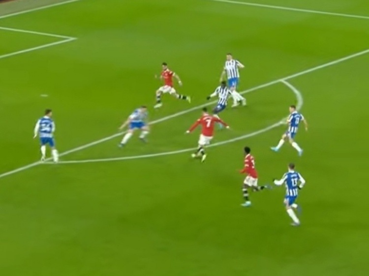足球导航网2月16日讯 英超第18轮补赛,曼联2-0布莱顿升至积分榜第四位。C罗本场比赛打破球荒,面对对方球员包夹劲射破门。