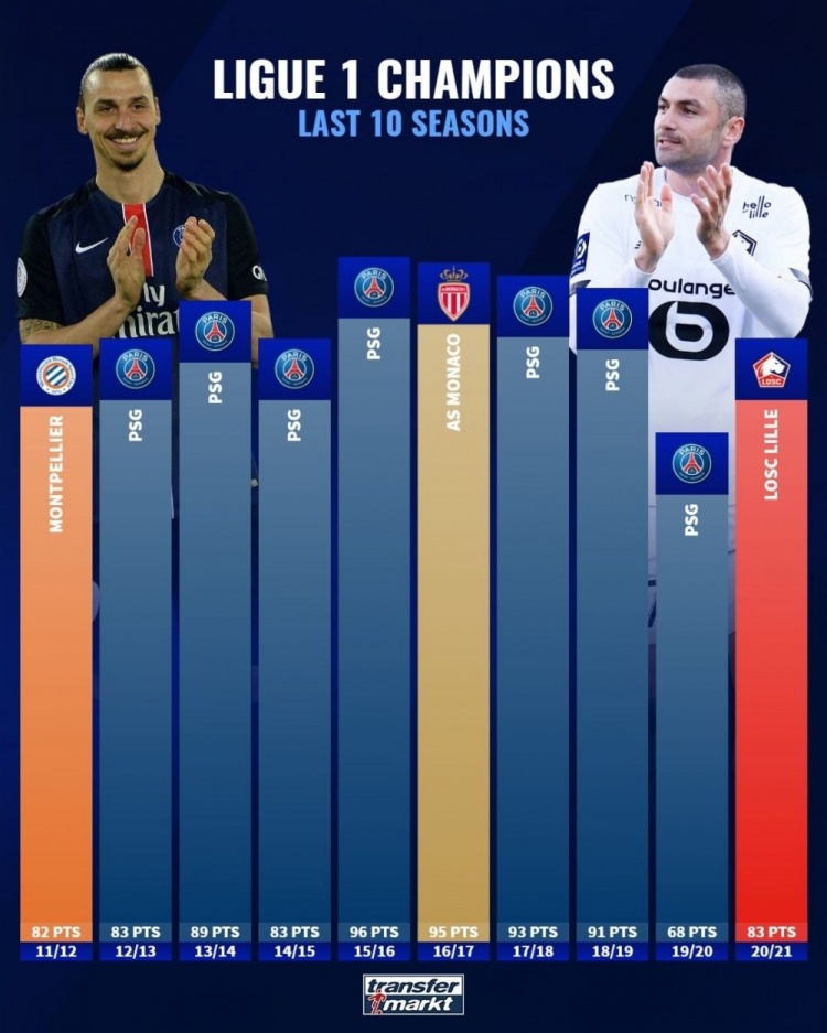 足球导航网2月26日讯 德转统计了近十年,夺得法甲冠军所需积分。最高分是大巴黎15/16夺冠赛季拿下的96分,最低分也来自大巴黎,19/20夺冠赛季的68分。