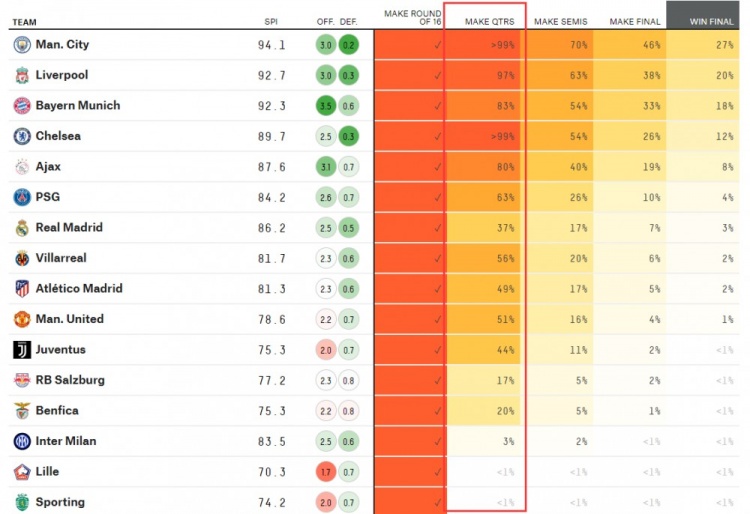 足球导航网3月8日讯 欧冠1/8决赛次回合明晨陆续打响,大数据网站fivethirtyeight预测了16队晋级欧冠8强的概率。