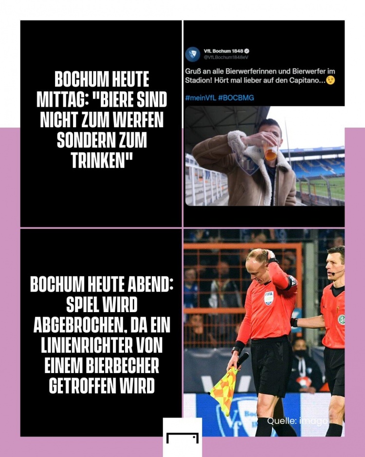 一场关系到两支球队保级命运的比赛,门兴客场2比0领先到下半时第69分钟,主队波鸿一位不理智的球迷将啤酒杯砸到边裁的后脑勺,比赛因此被中止,边裁被送往医院。这是疫情期间波鸿第一次迎来25000名球迷(几乎坐满)的比赛,队长洛西亚还特意在赛前拍摄视频提醒球迷,啤酒是用来喝的,不能乱扔啤酒杯……(上图封面)