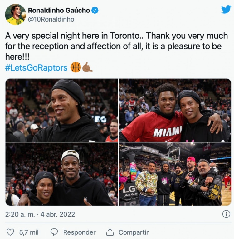 足球导航网4月4日讯 巴萨传奇球星罗纳尔迪尼奥昨晚去多伦多现场观看了多伦多猛龙与迈阿密热火的NBA比赛,并与几位NBA球星合影,随后他在个人推特上晒出了照片。