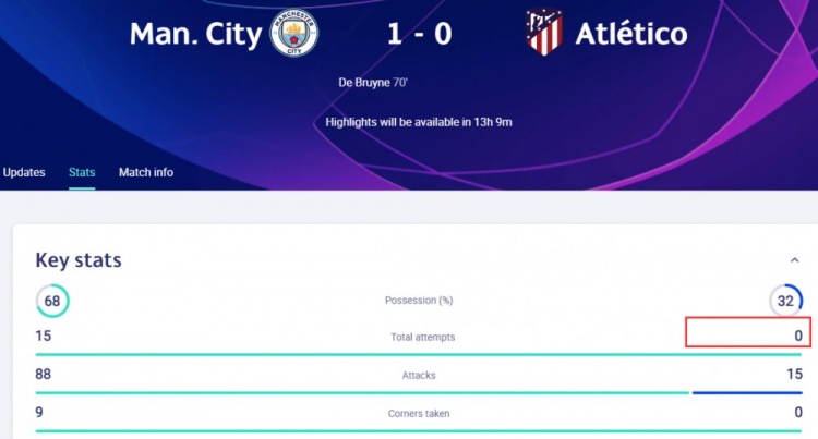 全场比赛曼城占据优势,赛后最初数据统计马竞本场有2次射门,2次射正