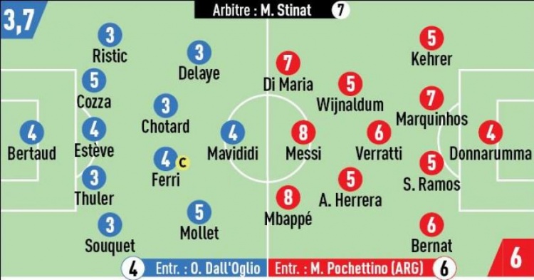 赛后法国媒体《队报》对巴黎球员进行了点评,并给姆巴佩、梅西打出了8分的高分(满分10分)。