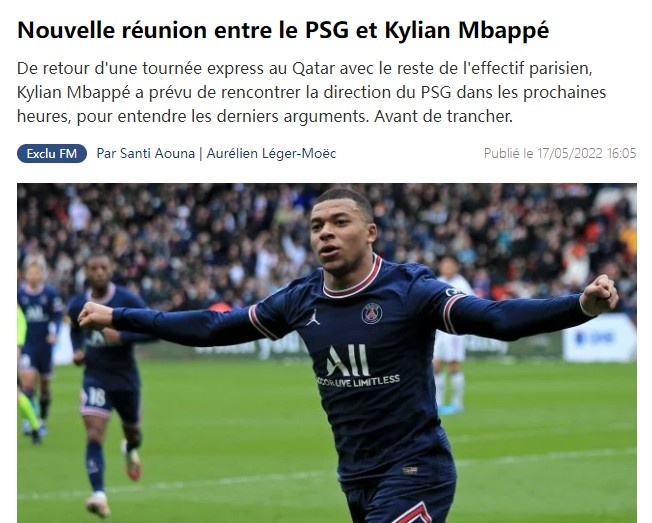 法媒报道,在姆巴佩与队友从卡塔尔回来后,他计划几小时内将与巴黎高层就自己的未来进行会面,听取最后的报价。
