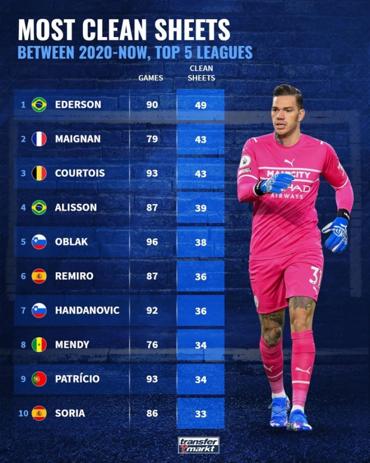 足球导航网7月18日讯 德转统计了2020年至今五大联赛零封榜,埃德森49次第一。