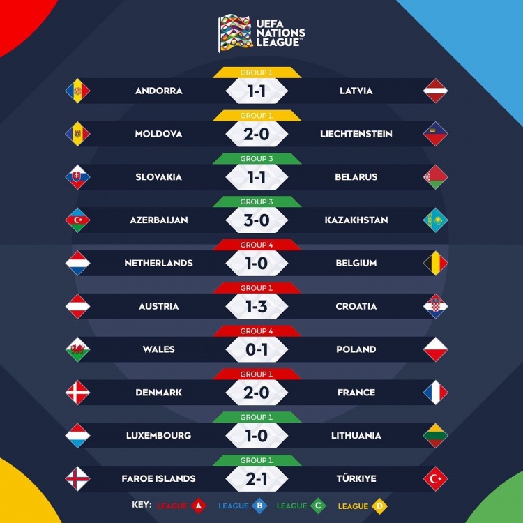 足球导航网9月26日讯 北京时间昨夜今晨,多场欧国联第6轮小组赛战罢,荷兰主场1比0小胜比利时,法国客场0比2不敌丹麦。